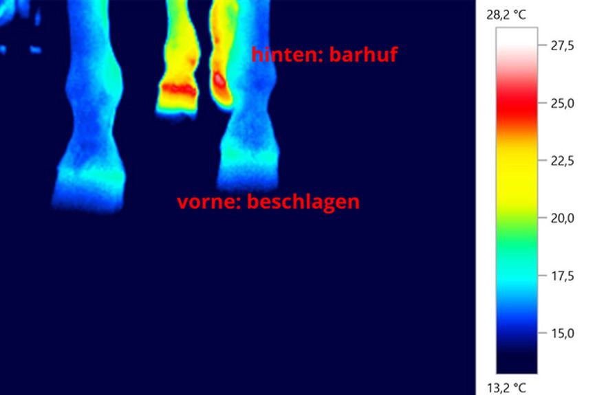 Auf dem Bild siehst du, wie sich die Hufpumpe im Wärmebild zeigt bzw. wie es aussieht, wenn sie durch Einwirkungen von Außen (z. B. Hufeisen) eingeschränkt wird.