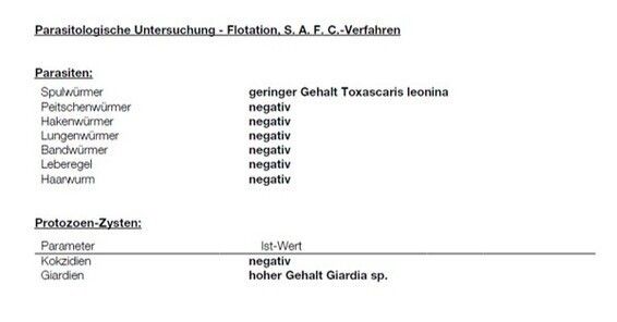Es wurde ein geringer Spulwurmbefall sowie ein hoher Gehalt an Giardien festgestellt. Das Darmflorascreen zeigte kaum gute Darmbakterien,einen geringen Gehalt eines fakultativ pathogenen Keims (Provicencia alcalifaciens), sowie positive Gasbildner, der Rest war unauffällig.